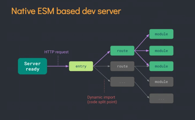 Vite以 原生ESM方式提供源码。这实际上是让浏览器接管了打包程序的部分工作:Vite只需要在浏览器请求源码时进行转换并按需提供源码。根据情景动态导入代码,即只在当前屏幕上实际使用时才会被处理。