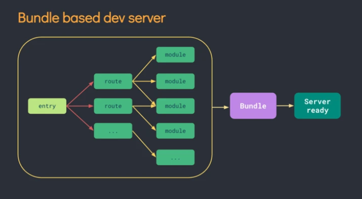 Webpack 启动时,从入口文件出发,调用所有配置的 Loader 对模块进行编译,再找出该模块依赖的模块,再递归本步骤直到所有入口依赖的文件都经过了本步骤的处理,一系列的递归操作非常耗时。 再看下Vite: